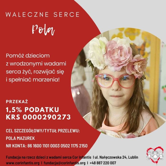 Pola przyszła na świat zdecydowanie za wcześnie. Kiedy się urodziła ważyła jedynie 750 g. 22 czerwca 2017 roku, wraz z pojawieniem się Poli na świecie rozpoczęła się jej niezwykle trudna walka o życie. Pola w czerwcu 2018 roku przeszła główną operację serduszka, największym problemem zostaje nadal zastawka aortalna, która jest niedomykalna. Po operacji niedomykalność była na poziomie I/II stopnia, niestety narasta i w tej chwili jest to już II/III stopień. Ostatnia wizyta kontrolna u Prof. Dangel, która odbyła się w sierpniu 2022 nie wykazała na szczęście istotnych zmian w serduszku Poli, natomiast córka musi być kontrolowana co 8-10 miesięcy.